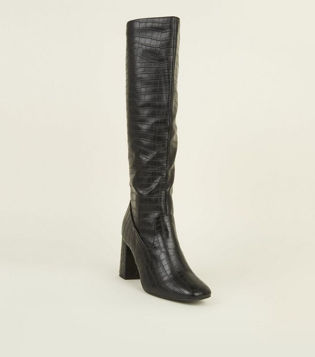 black-faux-croc-block-heel-knee-high-boots